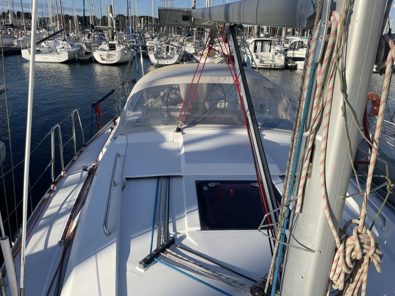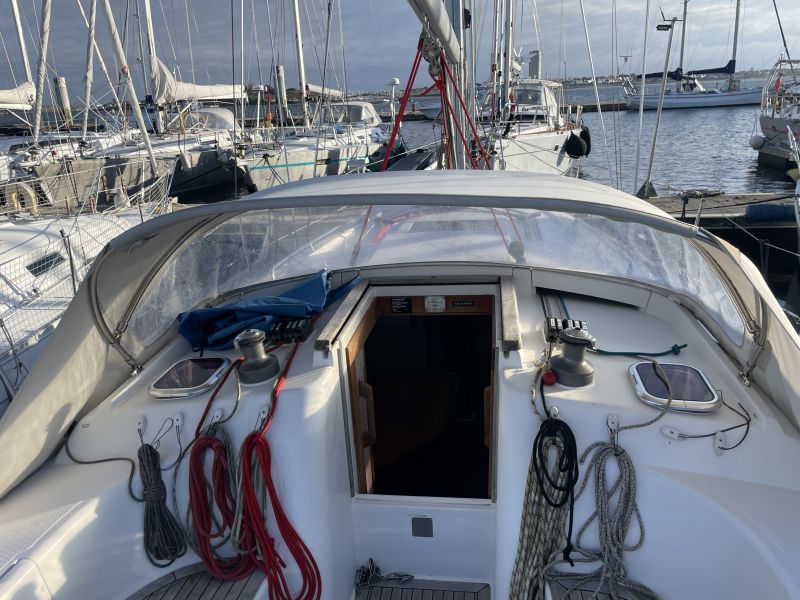 Sur le pont, ce Hanse 350 est également très équipé avec une capote de descente, un arceau intégrant support panneaux solaires et bossoirs, un guindeau électrique.